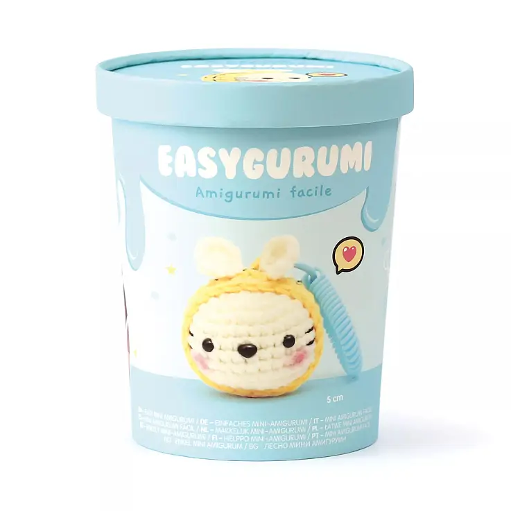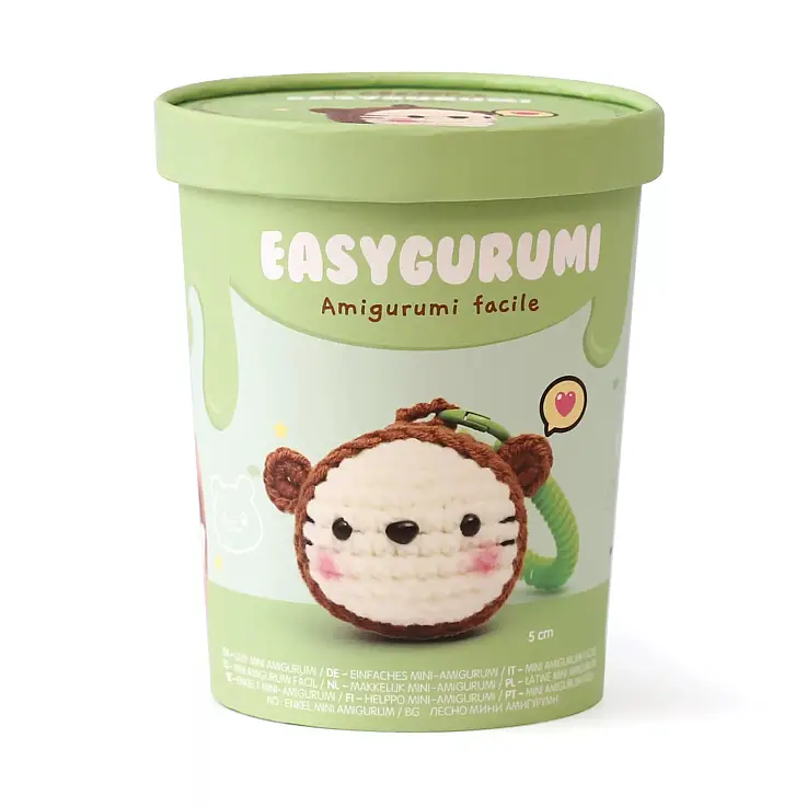 - Das einfache Amigurumi-Set zur Herstellung eines eigenen Schlüsselanhängers ist in einer illustrierten Pappschachtel verpackt.
