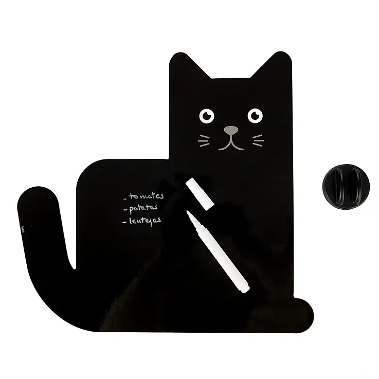 - Die magnetische schwarze Kitty-Kühlschranktafel ist in einer transparenten Plastiktüte mit illustriertem Kartondeckel verpackt.