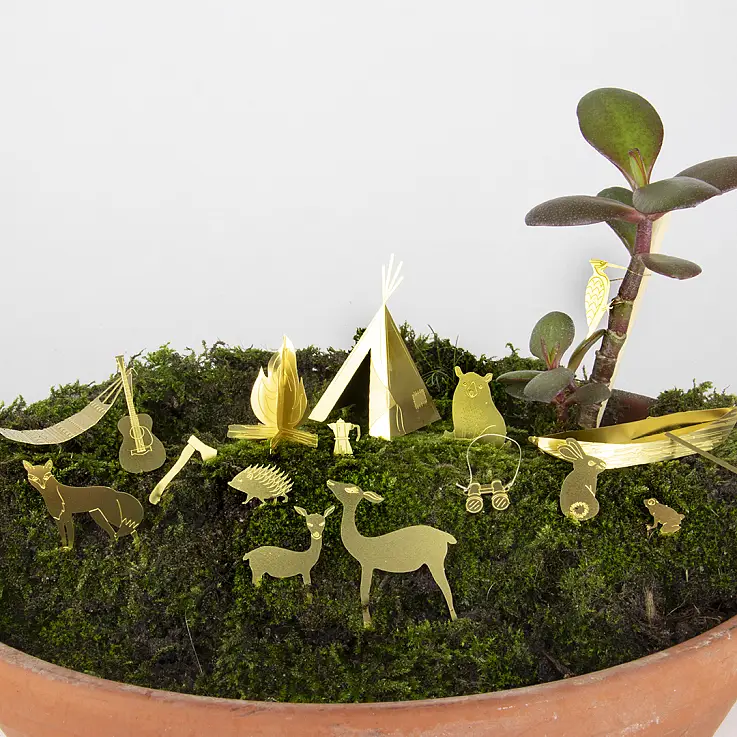 Verleihen Sie Ihren Pflanzen ein originelles und wertvolles Detail mit diesem Set aus Messingfiguren, das einen Campingausflug im Wald nachstellt. Ein Lagerfeuer, ein Zelt, ein Kanu? sogar ein Bär!