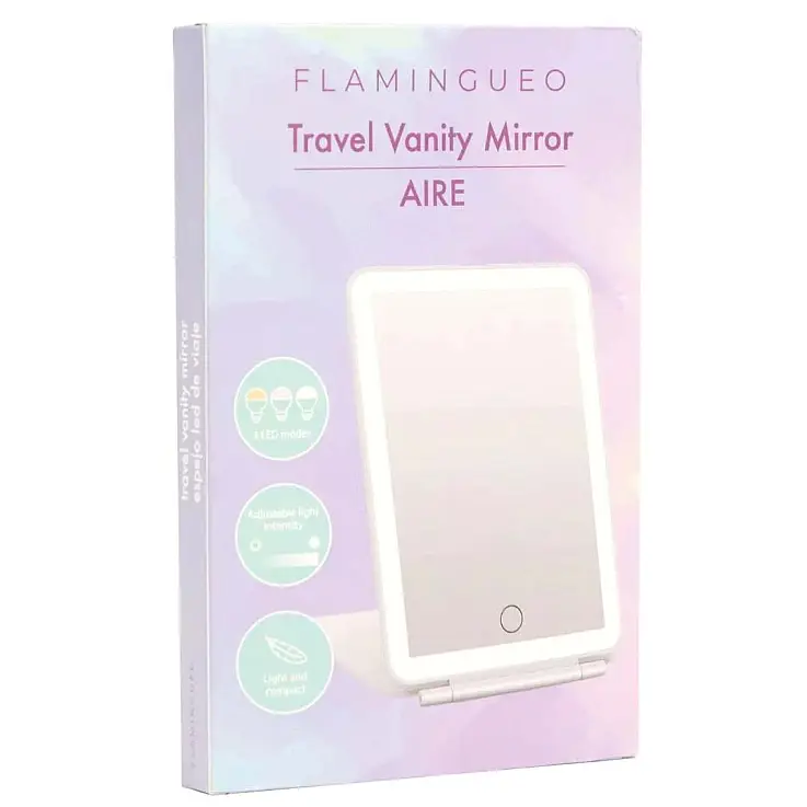 - Der Reisespiegel mit LED-Licht ist in einer illustrierten Pappschachtel verpackt.
