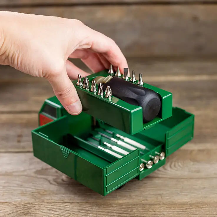 In einem kleinen LKW im Retro-Stil findest du einen Griff, zehn Schraubenzieherspitzen und sechs Präzisionsschraubenzieher.