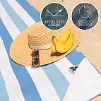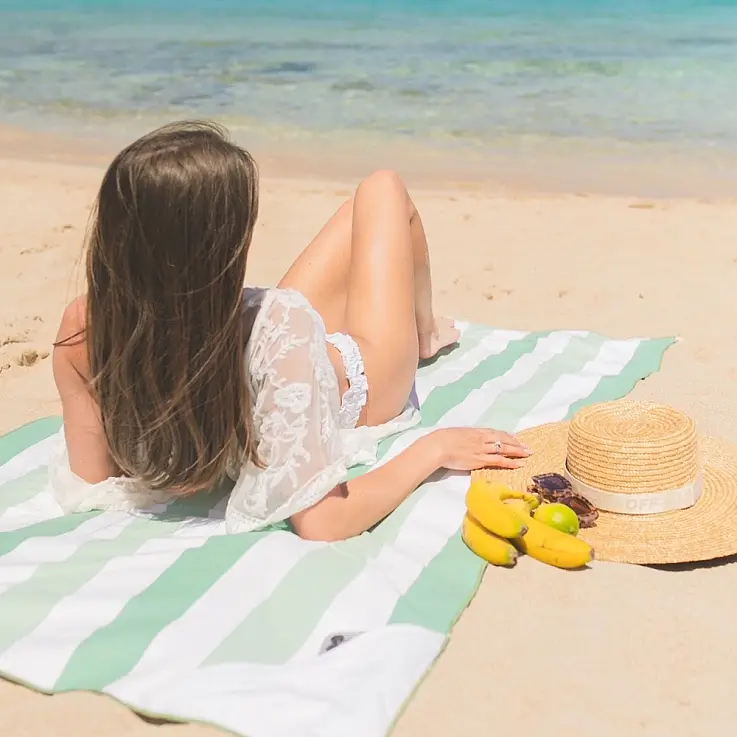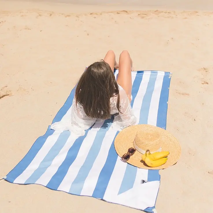 Es ist extra groß und misst 90 x 180 cm. Es besteht aus Mikrofaser, einem Material, das Sand abweist, sehr leicht ist und schnell trocknet, damit sich keine unangenehmen Gerüche festsetzen können.