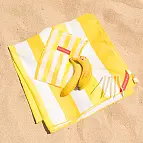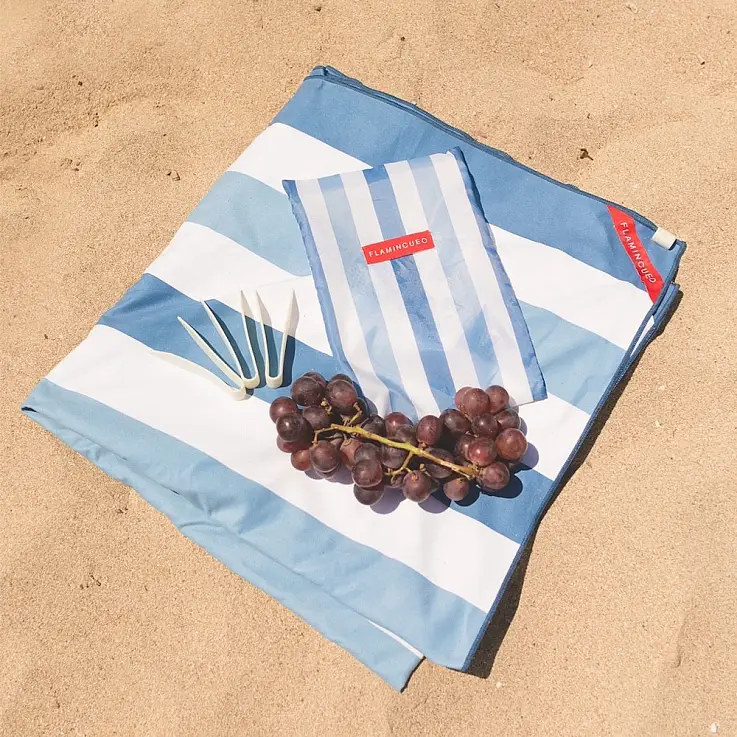 - Das gestreifte Strandtuch ist in einer transportablen Netztasche verpackt.