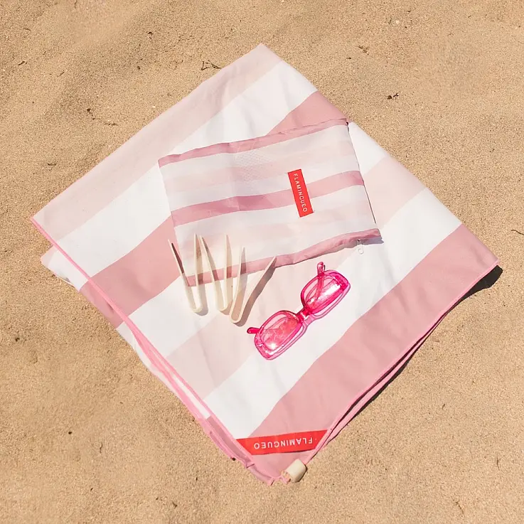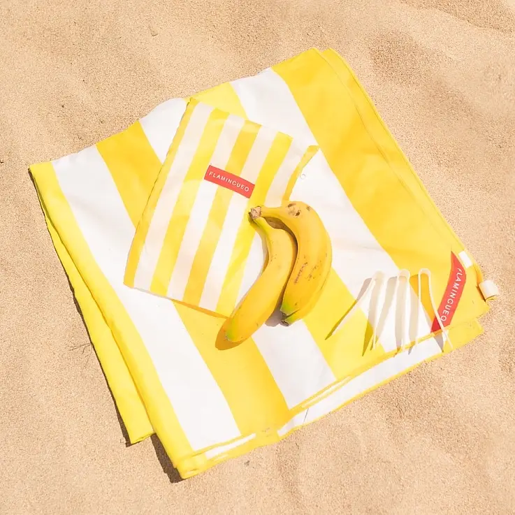 Das perfekte Strandtuch existiert: Dazu gibt es Klammern, um es im Sand zu verankern, es hat eine Tasche, ist groß, trocknet ultraschnell und es gibt vier verschiedene Farben!
