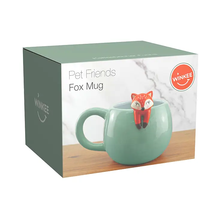 - Die Tasse mit dem herausschauenden Fuchs ist in einer illustrierten Pappschachtel verpackt.