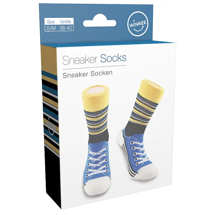 • Die Socken und Turnschuhe sind in einer illustrierten Pappschachtel verpackt.
