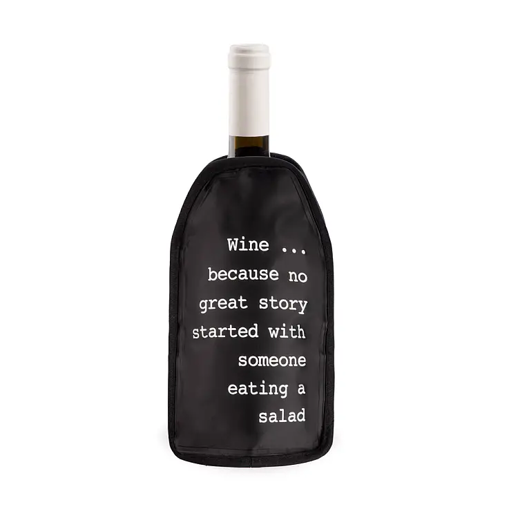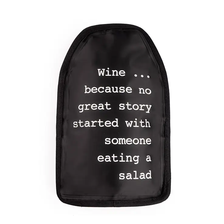 Sie ist für 750-ml-Flaschen geeignet, besteht aus schwarzem Nylon und ist in weißer Farbe mit dem englischen Satz Vino... bedruckt, denn keine große Geschichte begann damit, dass jemand Salat aß, etwas, worüber wir uns alle einig sind, oder?